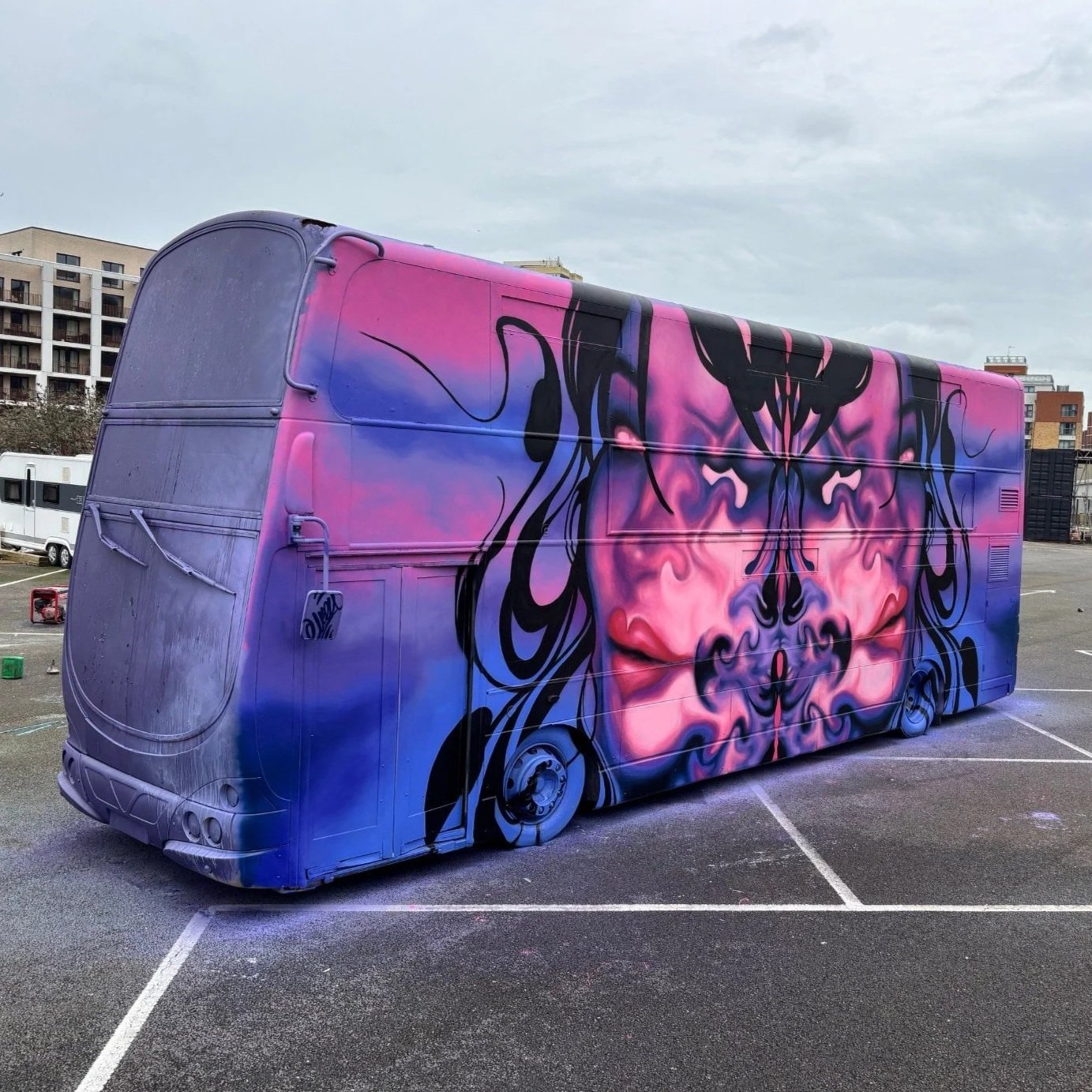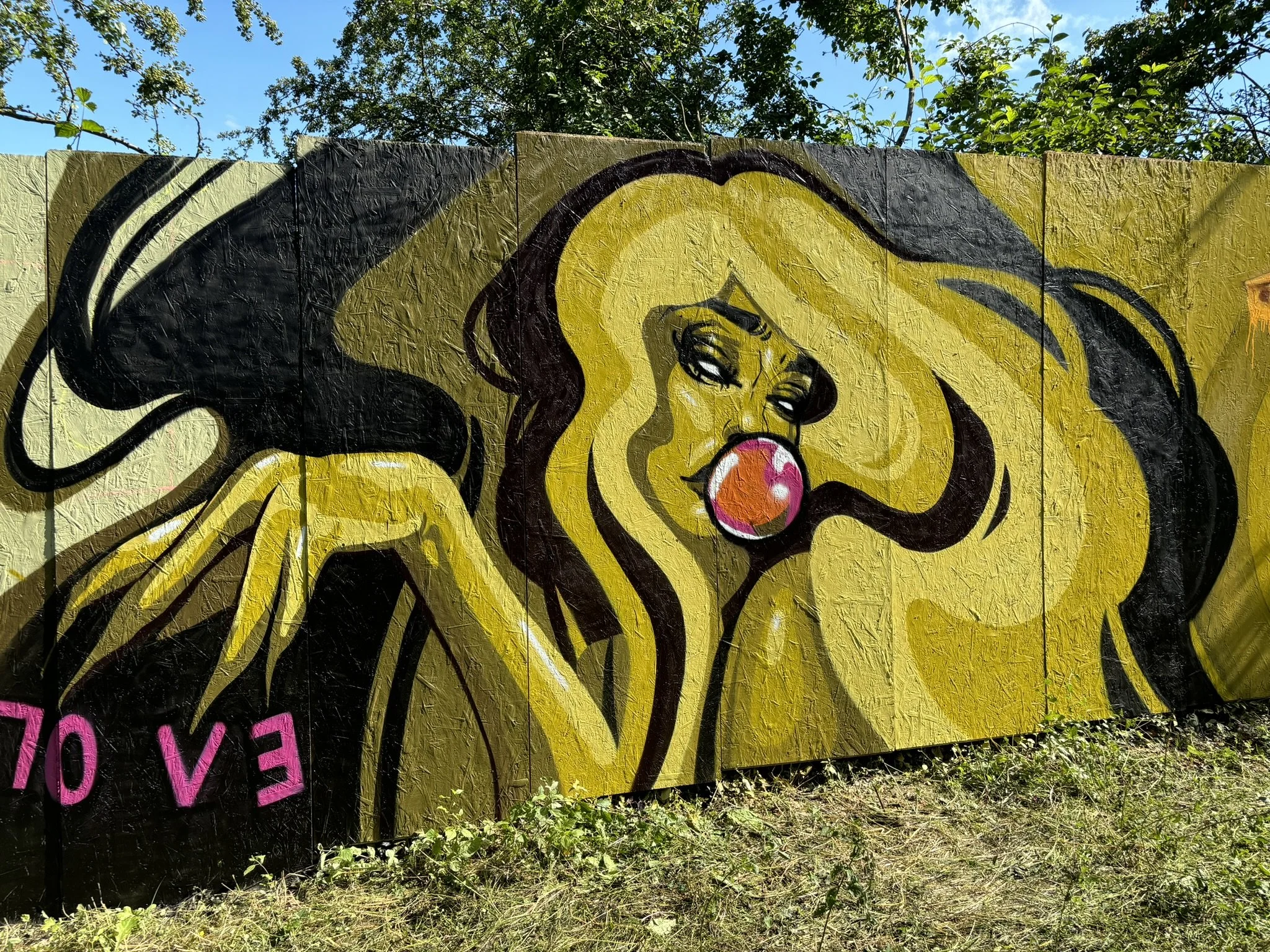 • A colorful mural featuring a stylized female face with orange and pink hair, blue skin, and expressive eyes. The mural also depicts two pink fish with yellow eyes, one on each side of the face, swimming among underwater plants and bubbles.